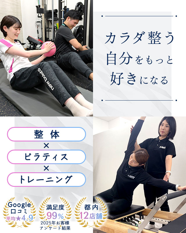 マシンピラティス&パーソナルジム ASFiTは、ピラティスとトレーニングによってカラダを内側から整えていくことのできるピラティス・トレーニングスタジオです。